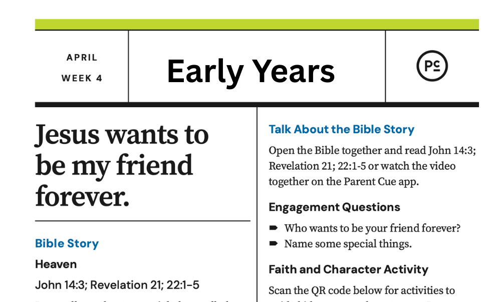 Early YearsAges 0-5 April 25 & 26Jesus promised that He is preparing a special place for His friends. Heaven is God’s perfect home where there is no sadness or pain. One day, everyone who loves Jesus will live with Him forever. Jesus wants to be our friend forever. Click the picture to watch the video. At-Home Activities PARENT LESSON GUIDE Worship Playlist FUN ACTIVITIES Articles Breaking the Cycle of Absent Fathers By Danny Huerta When pride leaves parenting By Jessica Hurlbut Patience With Kids: Avoiding The Rut Of Reacting By Josh Zeichik Simple ways to focus on Christ this Easter By JJ Campbel