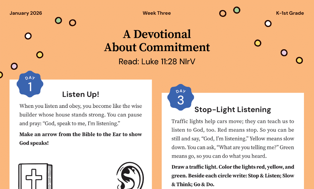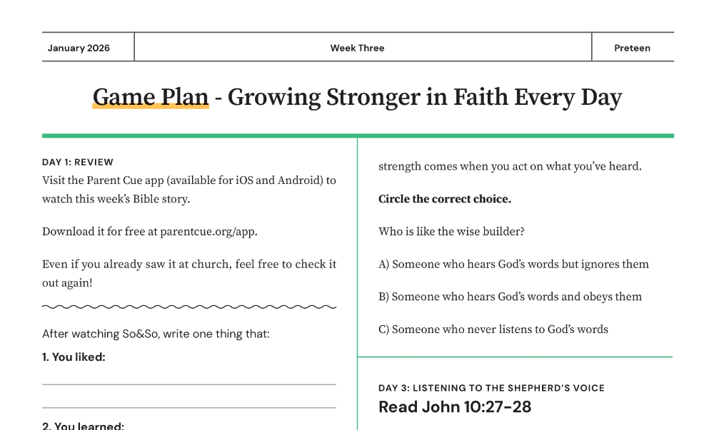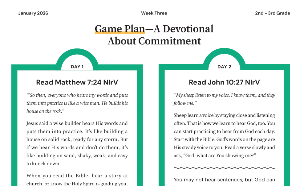 We’re staying in The Sermon on the Mount, where Jesus wraps up his teaching with the story of the Wise and Foolish Builders. Anyone who hears Jesus’ words and actually DOES them is like a wise man who built his house on a solid foundation of rock. When a wild storm whipped up, that house stood strong. But people who hear Jesus’ words and don’t follow through are just like a foolish man who slaps together a home on the sand—one that collapses when the wind comes. Truly hearing from God means putting what you hear into action. Kids can be confident that God does speak to them because, as we read in John 10:27-28, Jesus is the good shepherd and we are His sheep. And a sheep KNOWS the shepherd’s voice.