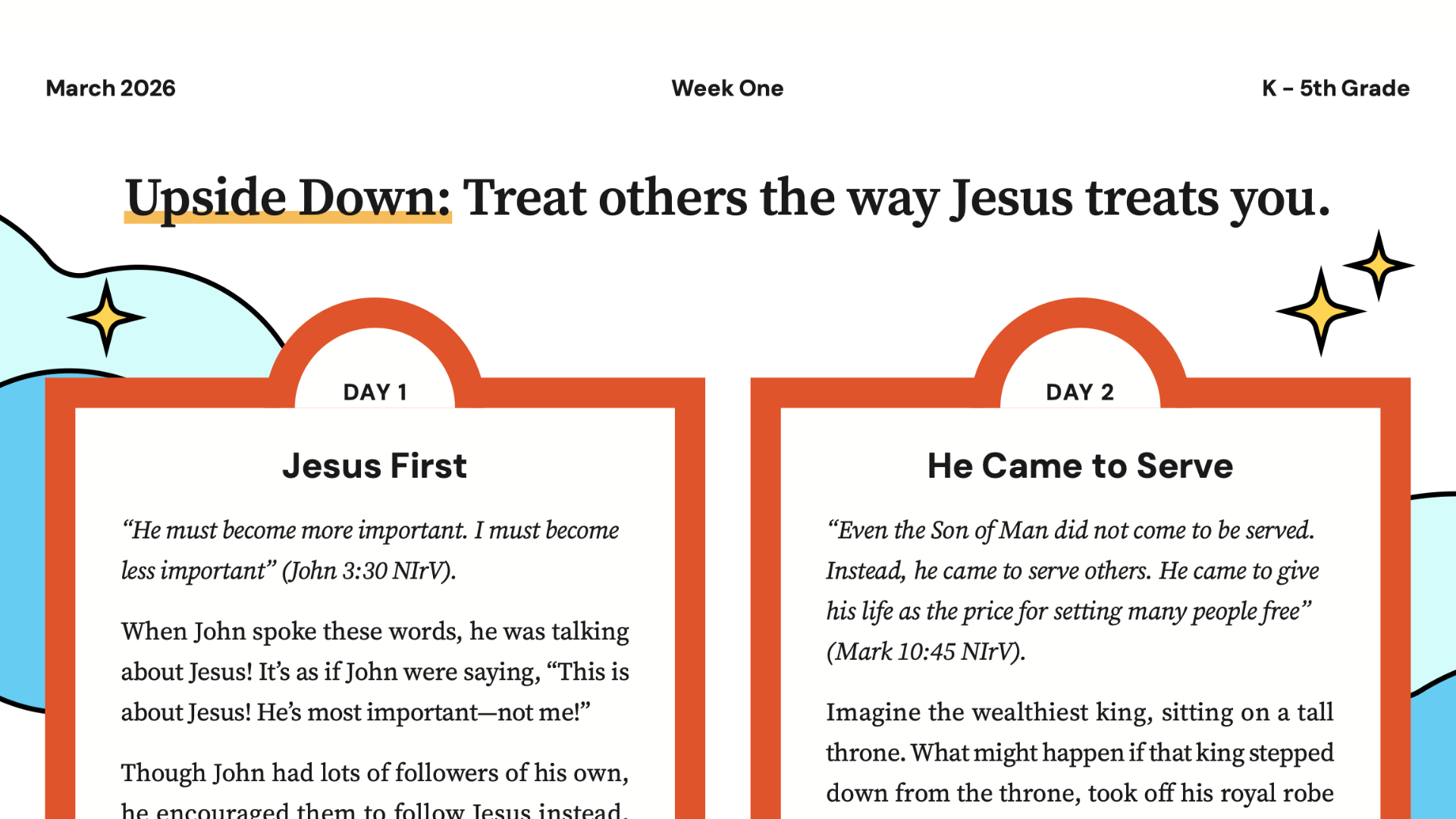 Many people followed John the Baptist, but when Jesus came, John did not want the attention for himself. He knew his job was to point people to Jesus. John said that Jesus must become more important, and he must become less important. This story teaches us to put Jesus first in our lives.